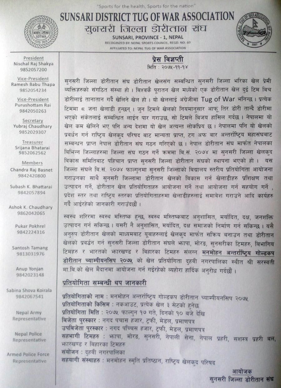 मनमोहन अन्तर्राष्ट्रिय गोल्डकप डोरीतान च्याम्पीयनसिप 2075 को तयारीको जानकारी दिन मिति 2075-11-14 गते पत्रकार सम्मेलन गरियो ।