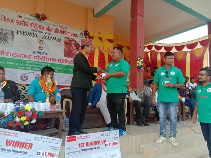 विराटनगर डोरीतान प्रतियोगिताको उद्घाटन खेल प्रदेश नं.१ का सांसदहरुको दुई समूह विभाजन गरेर गरिएको थियो । प्रतियोगिताको उपाधि नेपाल बन पैदावार उद्योग संघले हात पारेको छ । फाइनल खेलमा नेपाल बन पैदावर तथा उद्योग संघले मोडर्न एरा स्कुललाई २-१ को सेटमा पन्छाउदै उपाधि चुमेको हो । विजेता टोलीले ५१ हजार रुपैयाँ हात पार्यो भने दोश्रो हुने मोडर्न एरा स्कुलले ३१ हजार रुपैयाँमै चित्त बुझायो ।